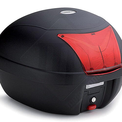 K26 – Baule / bauletto / portapacchi nero per moto – scooter – maxi scooter (scooterone) capacità 26 Lt, impermeabile con catadriotti rossi. Dimensioni piccole, adatto al trasporto di oggetti o di un solo casco. K26 rientra nella famiglia valigie e bauletti Monolock® System