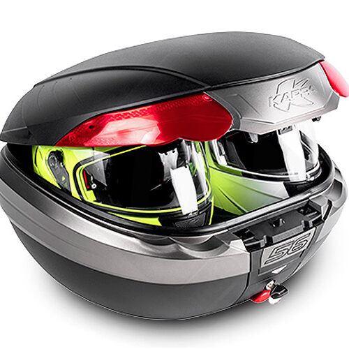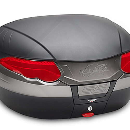 K56N bauletto / valigia porta oggetti da 55/56 lt (litri) nera goffrata con catadiottri rossi e cerniera dotata di maniglia estraibile per moto e scooter. Questo baule prevede la possibilità di applicare un cover verniciato. K56N rientra nella famiglia valigie e bauletti Monokey® System