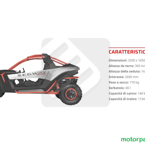 Motore Motore Bicilindrico a 4 tempi Cilindrata del motore 1000 cc Potenza 107 CV Coppia 98 N.m Iniezione Bosch s Sistema di trasmissione Differenziale anteriore con bloccaggio automatico Differenziale posteriore bloccabile Freno motore Sì Sospensioni Ammortizzatori a olio Freni Freni 4 dischi Cerchi e pneumatici Cerchi in alluminio da 14″ e Beadlock Ring Pneumatici CST…
