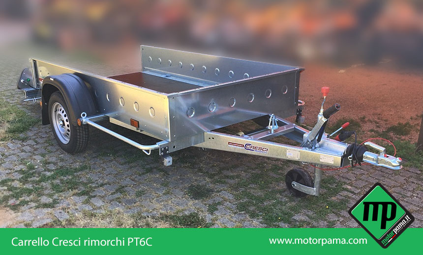Carrello / rimorchio Cresci rimorchi PT6C con pedana / rampa di salita per caricare comodamente i mezzi. Le sponde fisse alte 30 cmgarantiscono sicurezza per il trasporto di quad atv utv – scooter – moto – moto da corsa – trattore tagliaerba – ecc.