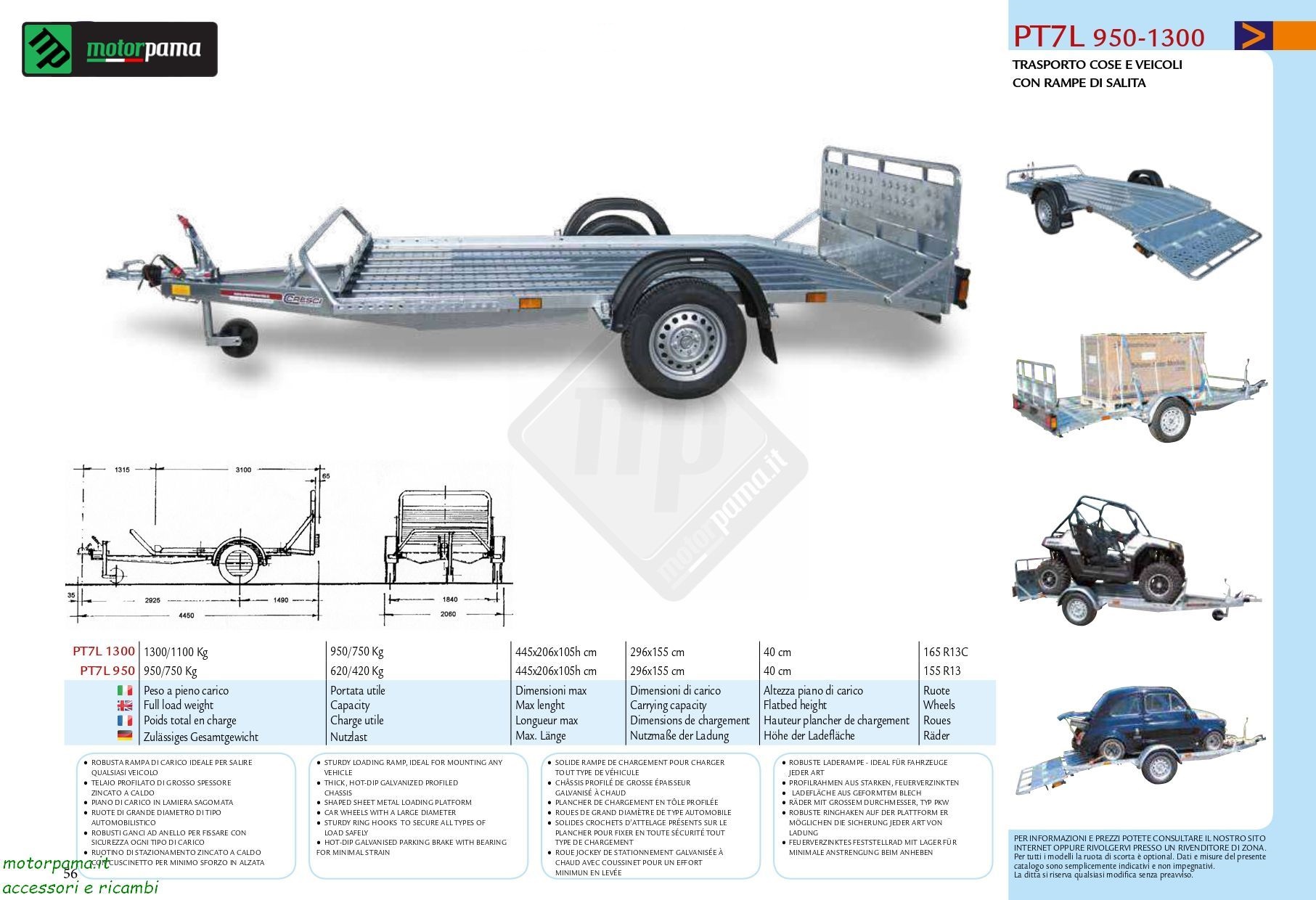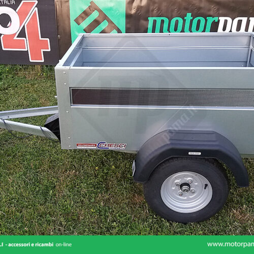 Carrello / rimorchio Cresci rimorchi PT7L con pianale basso e rampa di salita per facilitare il carico e scarico dei mezzi. Freno a repulsione.