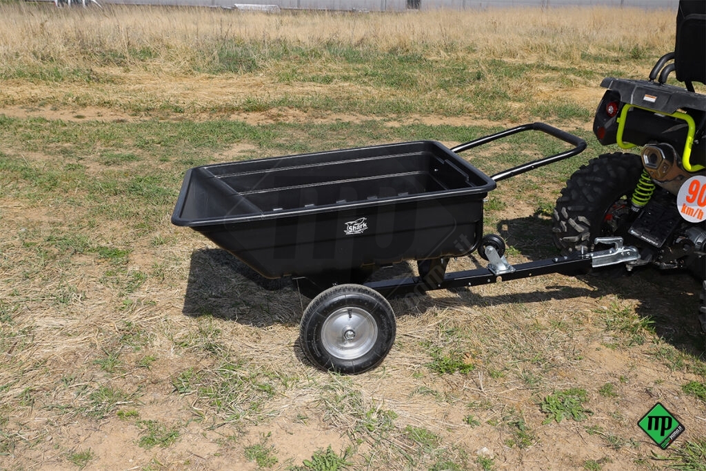 Due carrelli in uno: rimorchio multiuso da trainare dietro l’ATV può essere facilmente trasformato in carriola da giardino, capacità di carico 150 kg, vasca ribaltabile, terza ruota su timone pieghevole, vasca in polietilene resistente, robusto telaio interamente in acciaio, polvere finitura a cappotto