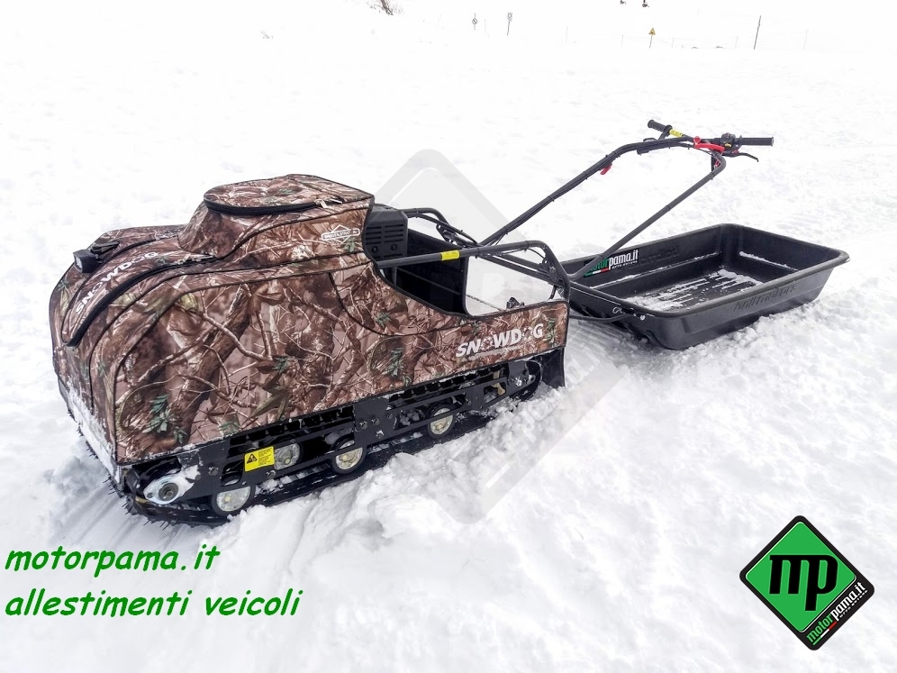 SNOW DOG (ovvero chiamato anche cane da neve) veicolo CINGOLATO da traino adatto per il trasporto di persone e materiale, utilizzo universale 4 stagione grazie al suo peso limitato e alla grande superficie di appoggio del cingolo, sulla neve sia battuta che fresca, sui terreni di difficile accesso, motore Profi Brigg & Stratton XR 1450, 306 CC, alesaggio diametro 82 mm, corsa 52 mm, 4 tempi, potenza 10 HP cavalli (Kw 7.35), raffreddamento ad aria, avviamento a strappo, avviamento elettrico con batteria 12 Volts, consumo medio benzina calcolato su terreno piano 3.00 litri/ora, Variatore di Velocità tipo CVT a cinghia trapezoidale, trasmissione meccanica a catena su ruota dentata, trazione su asse anteriore, cingolo tipo rinforzato in gomma larghezza 500 mm (altezza profilo 22 mm) sviluppo 2424 mm (PO 95″), sospensione multi molla a torsione, guide sostegno cingolo a ruote montate su bracci oscillanti, portapacchi per il trasporto di materiale, velocità regolabile da 0 a 25 Km/h, gancio traino con sicurezza anti sgancio, piano di carico in pannello multistrato marino incollato a strati e resistente alle intemperie, peso massimo trasportabile sulla macchina 45 Kg, peso massimo trainabile 300 Kg (su slitta o rimorchio), freno a disco meccanico, freno di stazionamento, luce anteriore a LED potenza 8 Watt, comandi posizionati sul manubrio (lunghezza dello stesso circa 1000 mm), manubrio regolabile in altezza (3 posizioni), acceleratore a manopola rotativa, freno di servizio a leva, blocco meccanico del freno per il parcheggio, commutatore di luce, bottone avviamento motore, arresto motore, copertura del motore in tela speciale resistente all’acqua e ai raggi ultravioletti compresa nel prezzo, stacca massa di sicurezza, peso 120 Kg Dimensione di ingombro, lunghezza 1250 mm (con manubrio ripiegato), larghezza esterna 550 mm, altezza 800 mm Può essere facilmente trasportato nel baule di un auto Accessori da ordinare separatamente -Slitta speciale in materiale composto con gu