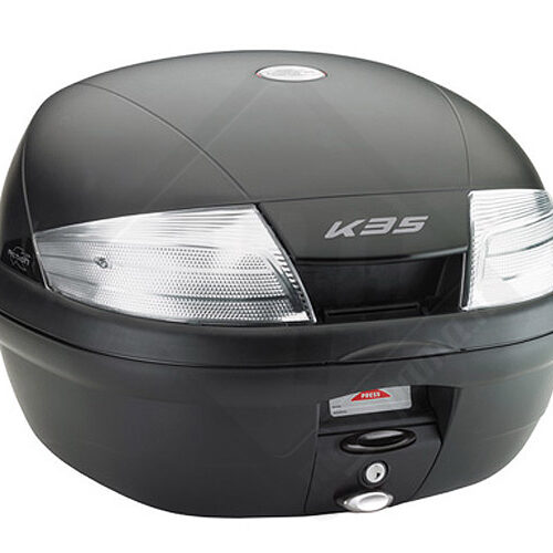 K35NT – Baule / bauletto / portapacchi Kappa K35NT capacità 35 Lt può contenere 1 casco adatto a scooter e maxi scooter. Di colore nero con catadiottri trasparenti. K35NT rientra nella famiglia valigie e bauletti Monolock® System