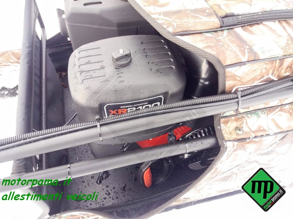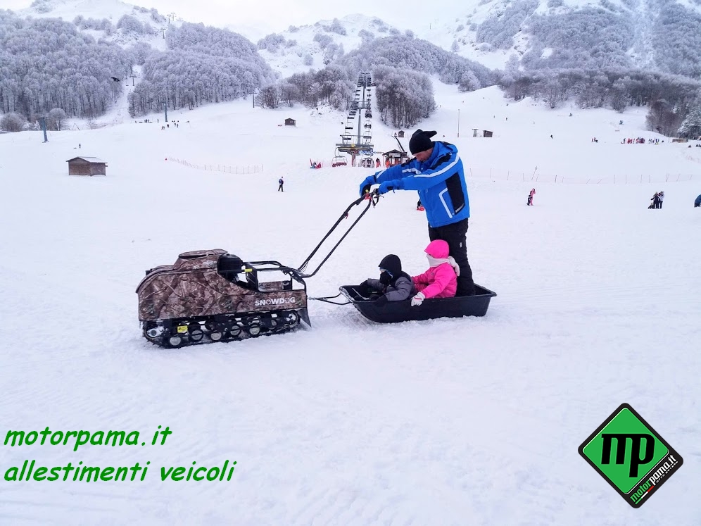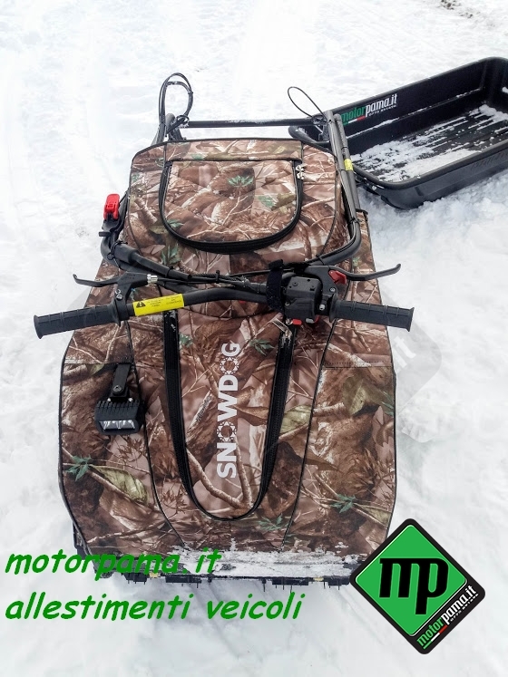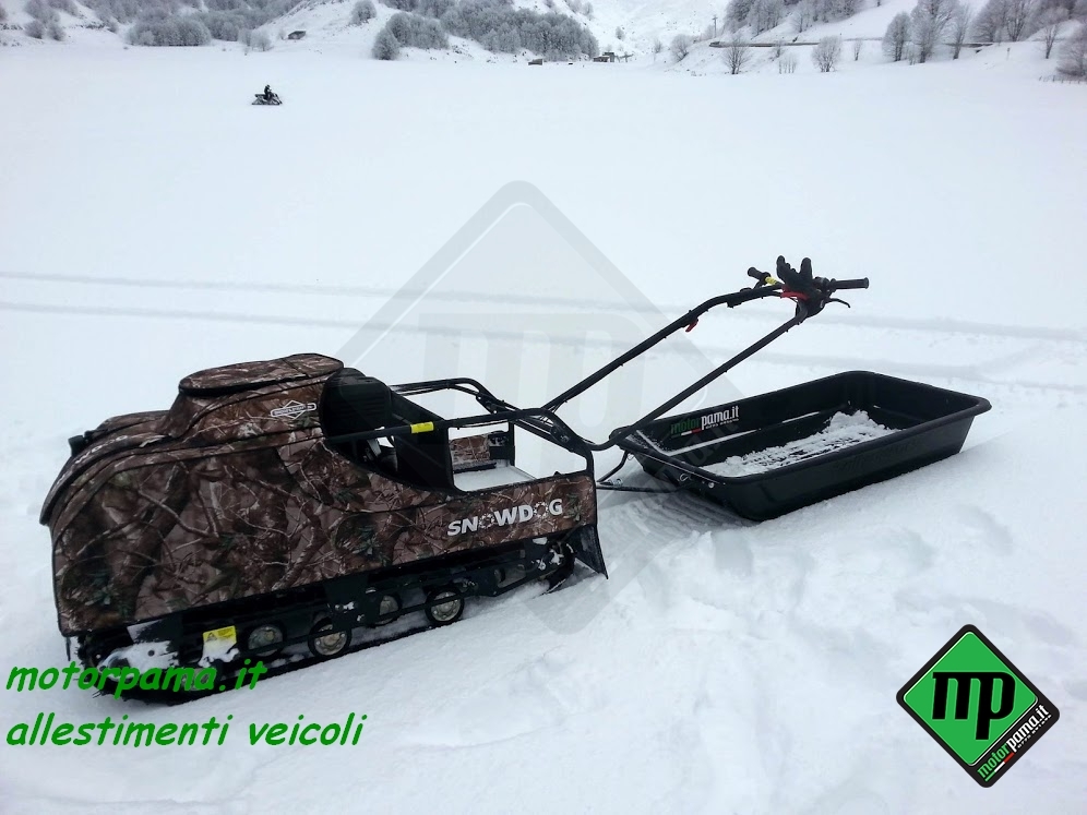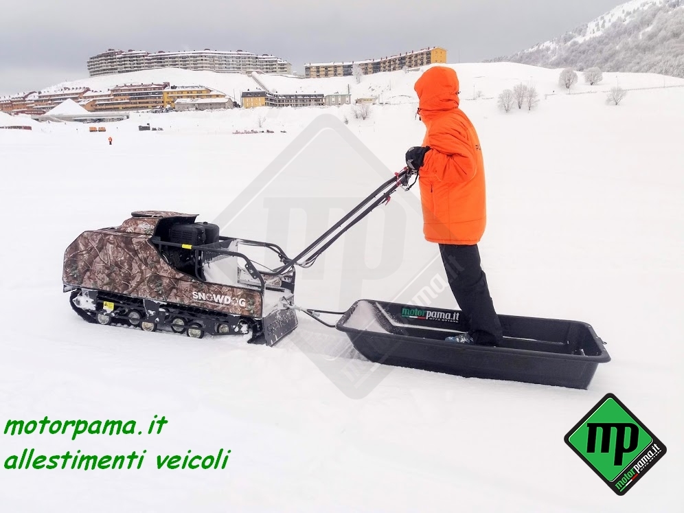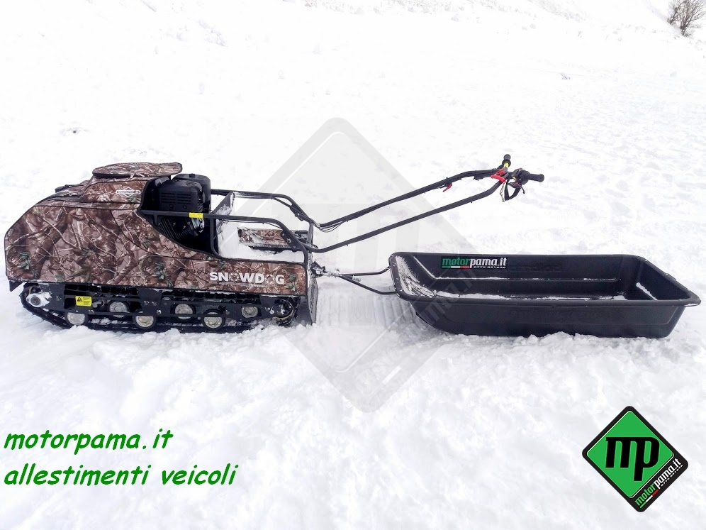 SNOW DOG (ovvero chiamato anche cane da neve) veicolo CINGOLATO da traino adatto per il trasporto di persone e materiale, utilizzo universale 4 stagione grazie al suo peso limitato e alla grande superficie di appoggio del cingolo, sulla neve sia battuta che fresca, sui terreni di difficile accesso, motore Profi Brigg & Stratton XR 1450, 306 CC, alesaggio diametro 82 mm, corsa 52 mm, 4 tempi, potenza 10 HP cavalli (Kw 7.35), raffreddamento ad aria, avviamento a strappo, avviamento elettrico con batteria 12 Volts, consumo medio benzina calcolato su terreno piano 3.00 litri/ora, Variatore di Velocità tipo CVT a cinghia trapezoidale, trasmissione meccanica a catena su ruota dentata, trazione su asse anteriore, cingolo tipo rinforzato in gomma larghezza 500 mm (altezza profilo 22 mm) sviluppo 2424 mm (PO 95″), sospensione multi molla a torsione, guide sostegno cingolo a ruote montate su bracci oscillanti, portapacchi per il trasporto di materiale, velocità regolabile da 0 a 25 Km/h, gancio traino con sicurezza anti sgancio, piano di carico in pannello multistrato marino incollato a strati e resistente alle intemperie, peso massimo trasportabile sulla macchina 45 Kg, peso massimo trainabile 300 Kg (su slitta o rimorchio), freno a disco meccanico, freno di stazionamento, luce anteriore a LED potenza 8 Watt, comandi posizionati sul manubrio (lunghezza dello stesso circa 1000 mm), manubrio regolabile in altezza (3 posizioni), acceleratore a manopola rotativa, freno di servizio a leva, blocco meccanico del freno per il parcheggio, commutatore di luce, bottone avviamento motore, arresto motore, copertura del motore in tela speciale resistente all’acqua e ai raggi ultravioletti compresa nel prezzo, stacca massa di sicurezza, peso 120 Kg Dimensione di ingombro, lunghezza 1250 mm (con manubrio ripiegato), larghezza esterna 550 mm, altezza 800 mm Può essere facilmente trasportato nel baule di un auto Accessori da ordinare separatamente -Slitta speciale in materiale composto con gu