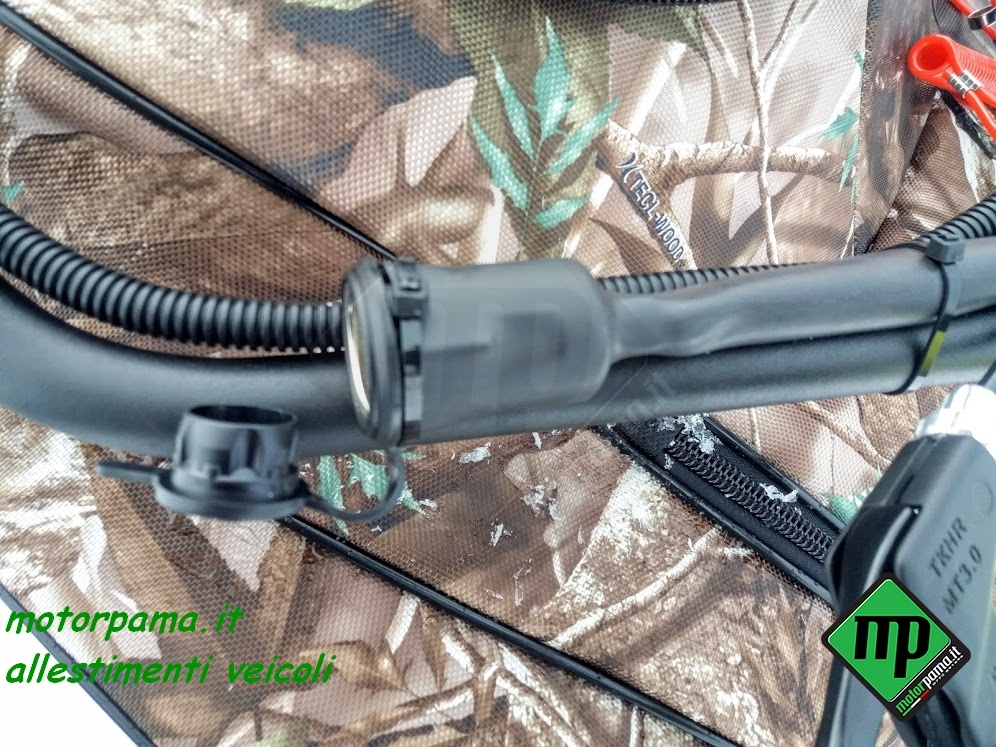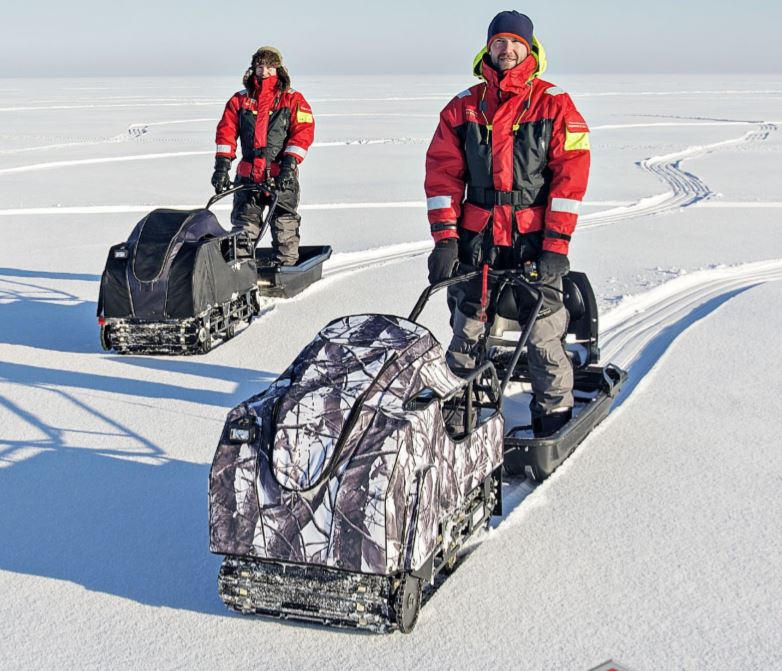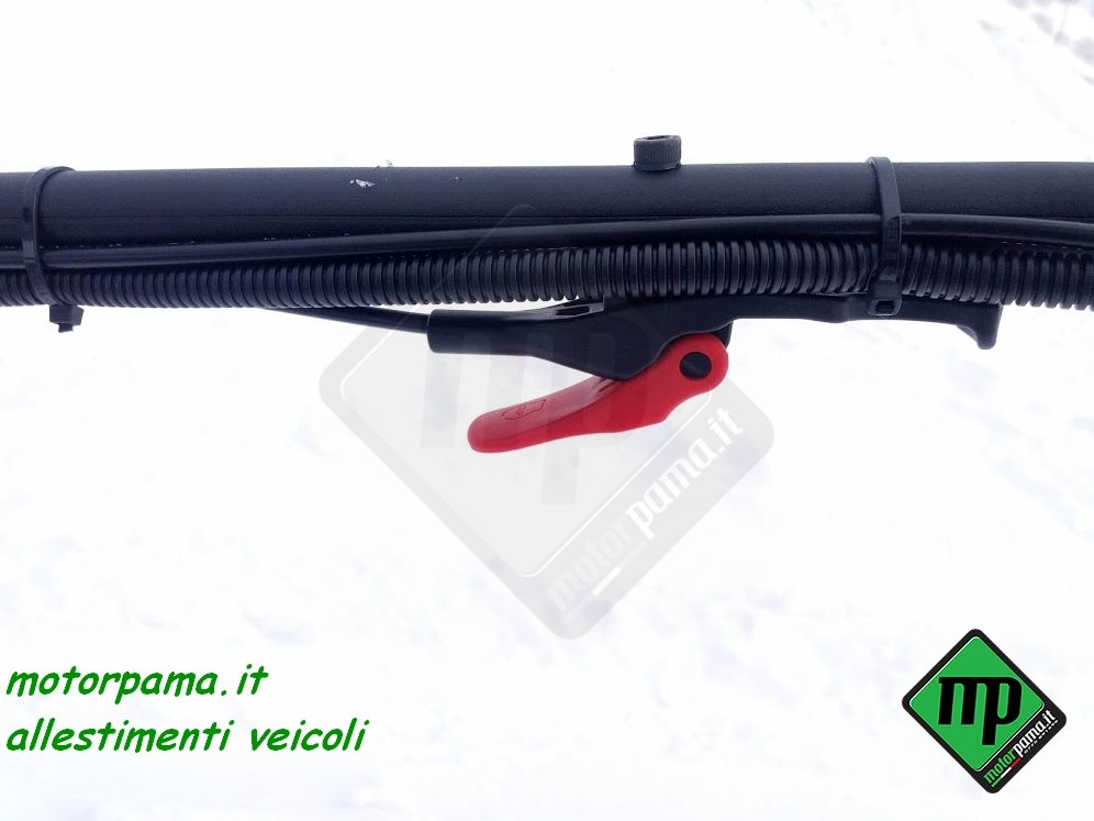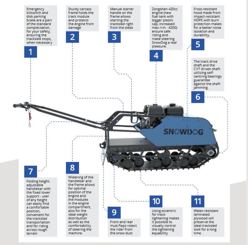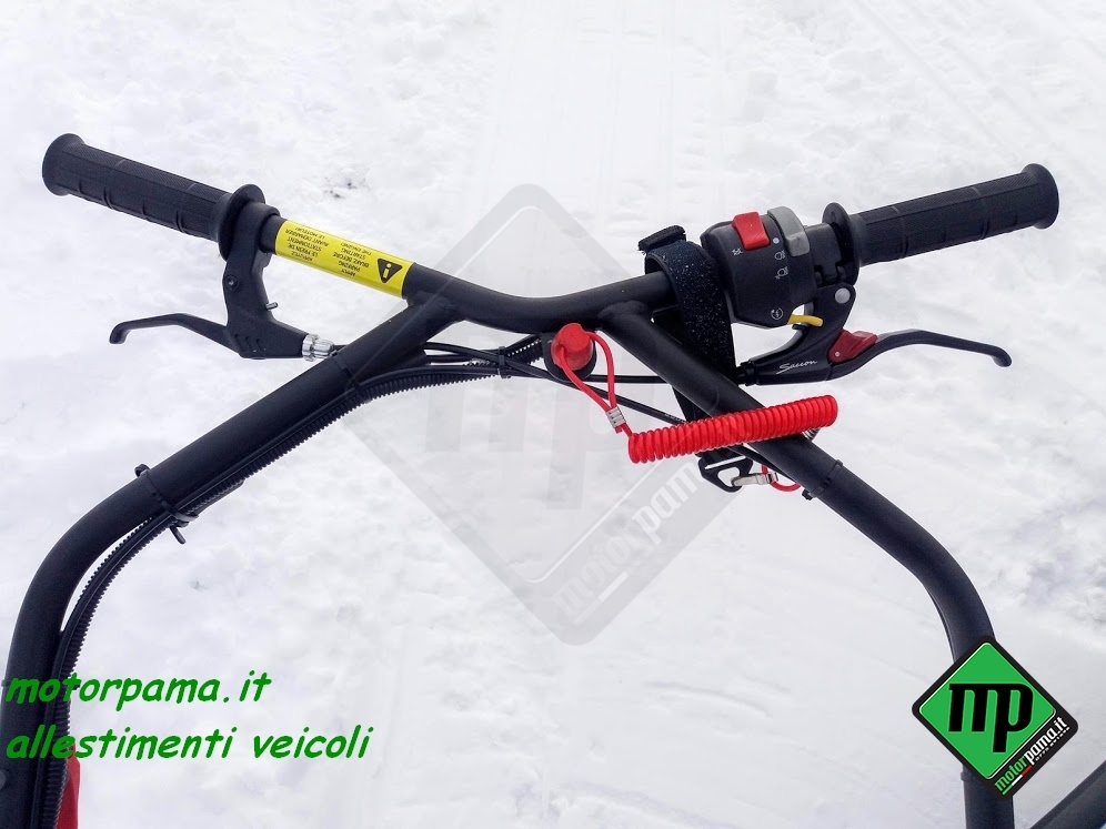 SNOW DOG (ovvero chiamato anche cane da neve) veicolo CINGOLATO da traino adatto per il trasporto di persone e materiale, utilizzo universale 4 stagione grazie al suo peso limitato e alla grande superficie di appoggio del cingolo, sulla neve sia battuta che fresca, sui terreni di difficile accesso, motore Profi Brigg & Stratton XR 1450, 306 CC, alesaggio diametro 82 mm, corsa 52 mm, 4 tempi, potenza 10 HP cavalli (Kw 7.35), raffreddamento ad aria, avviamento a strappo, avviamento elettrico con batteria 12 Volts, consumo medio benzina calcolato su terreno piano 3.00 litri/ora, Variatore di Velocità tipo CVT a cinghia trapezoidale, trasmissione meccanica a catena su ruota dentata, trazione su asse anteriore, cingolo tipo rinforzato in gomma larghezza 500 mm (altezza profilo 22 mm) sviluppo 2424 mm (PO 95″), sospensione multi molla a torsione, guide sostegno cingolo a ruote montate su bracci oscillanti, portapacchi per il trasporto di materiale, velocità regolabile da 0 a 25 Km/h, gancio traino con sicurezza anti sgancio, piano di carico in pannello multistrato marino incollato a strati e resistente alle intemperie, peso massimo trasportabile sulla macchina 45 Kg, peso massimo trainabile 300 Kg (su slitta o rimorchio), freno a disco meccanico, freno di stazionamento, luce anteriore a LED potenza 8 Watt, comandi posizionati sul manubrio (lunghezza dello stesso circa 1000 mm), manubrio regolabile in altezza (3 posizioni), acceleratore a manopola rotativa, freno di servizio a leva, blocco meccanico del freno per il parcheggio, commutatore di luce, bottone avviamento motore, arresto motore, copertura del motore in tela speciale resistente all’acqua e ai raggi ultravioletti compresa nel prezzo, stacca massa di sicurezza, peso 120 Kg Dimensione di ingombro, lunghezza 1250 mm (con manubrio ripiegato), larghezza esterna 550 mm, altezza 800 mm Può essere facilmente trasportato nel baule di un auto Accessori da ordinare separatamente -Slitta speciale in materiale composto con gu